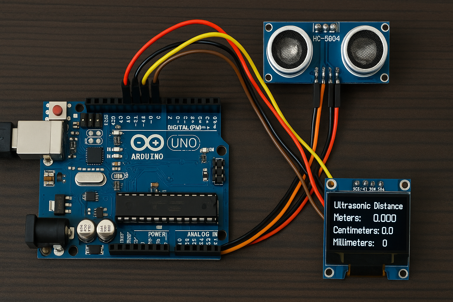 Learn how to build an Arduino-based distance measurement device using the HC-SR04 ultrasonic sensor and a 128×64 I2C OLED (SSD1306). Displays accurate distances in millimeters, centimeters, and meters. Perfect for DIY robotics, water level monitoring, parking sensors, and more.