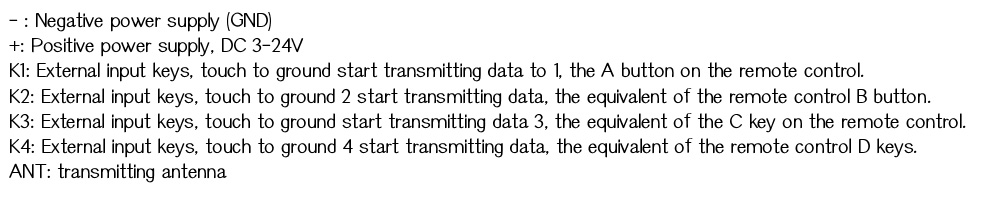 - The output: 4 channel CMOS level signal Corresponding to the remote control ABCD 4 buttons.