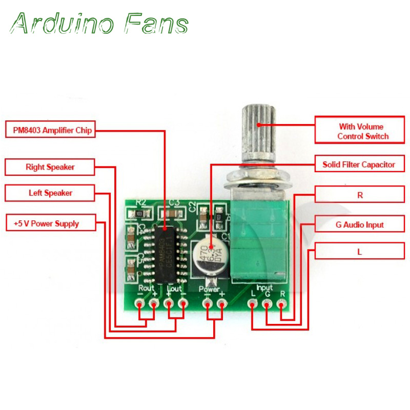 - Using High Quality PAM8403 Digital Amplifier IC with Volume Control and On / Off